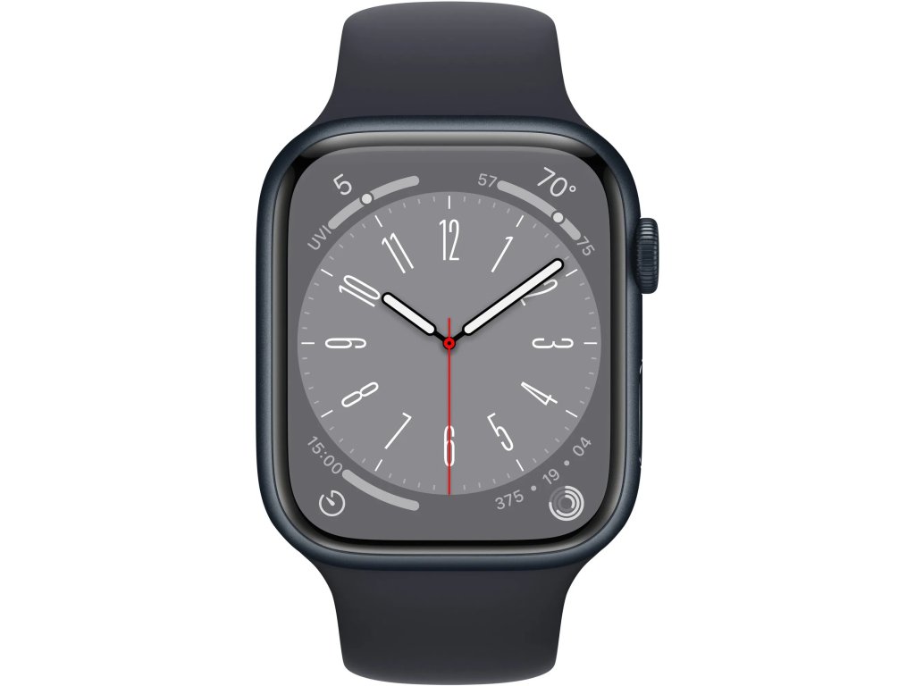 Chytré hodinky - Apple Watch Series 8 45mm, OLED displej, 1GB RAM, 32GB paměť, telefonování s eSIM kartou, GPS, NFC, měření tepu a EKG, monitoring spánku, krokoměr, oxymetr, hledání telefonu, ovládání hudby, obchod s aplikacemi, vlastní ciferníky, navigace, vhodné na sport, detekce pádu, materiál pouzdra hliník, watchOS, bez řemínku a nabíječky